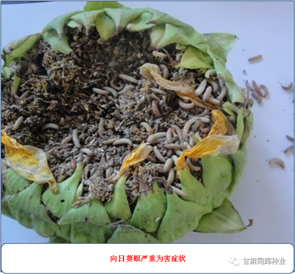 向日葵螟又叫葵螟,以幼蟲為害花盤、萼片和籽粒,花盤被害率一般在20~50%,重者100%;籽粒被害率一般在10%以上,重者達(dá)80%以上。受害花盤一般有幼蟲1~5頭,最多達(dá)100多頭。幼蟲蛀入花盤吃掉種仁,并蛀成許多隧道,還將咬下的碎屑和糞便填充隧道里造成污染,遇雨后造成花盤及籽粒發(fā)霉腐爛,不但嚴(yán)重影響產(chǎn)量,同時還嚴(yán)重影響葵花商品性。目前,葵螟已成為西北向日葵產(chǎn)區(qū)最為主要的蟲害之一,并且蟲害逐年加重趨勢明顯,給向日葵生產(chǎn)造成很大的經(jīng)濟(jì)損失,因此必須高度重視葵螟的防治工作!