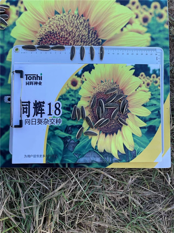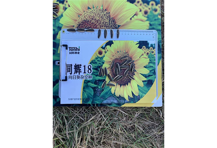 食葵,中早熟品種,平均生育期101天。株高160厘米左右,平均盤徑24厘米,花盤傾斜度4級,結(jié)實率62%,葉色中綠,花盤平整,籽;业装走叄骄iL2.45厘米,寬0.95厘米。